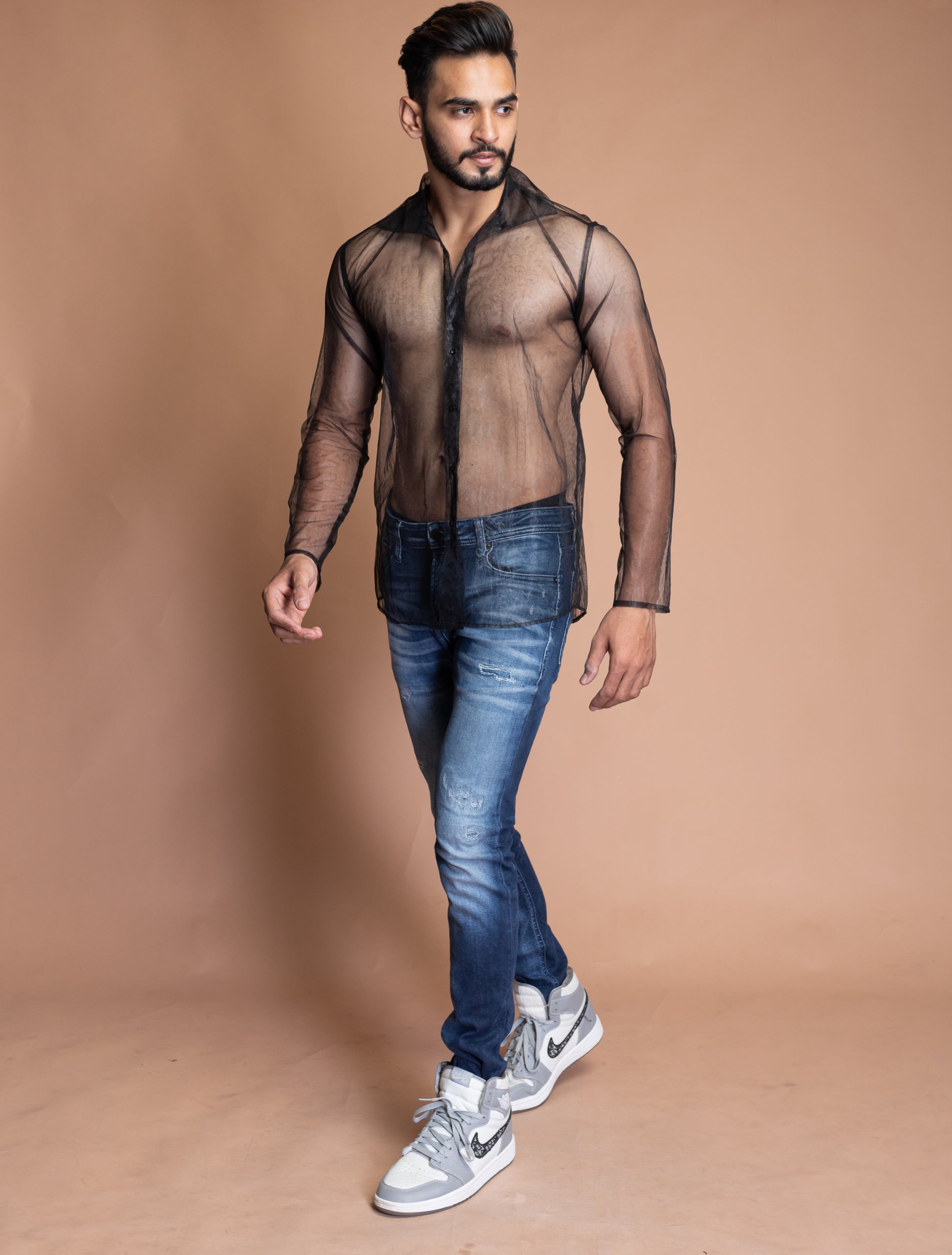 This black see through net shirt features half sleeves, offering a modern and stylish look. The sheer fabric allows for breathable wear while adding a touch of party bling to any outfit. Perfect for party wear, this shirt is a versatile addition to any wardrobe