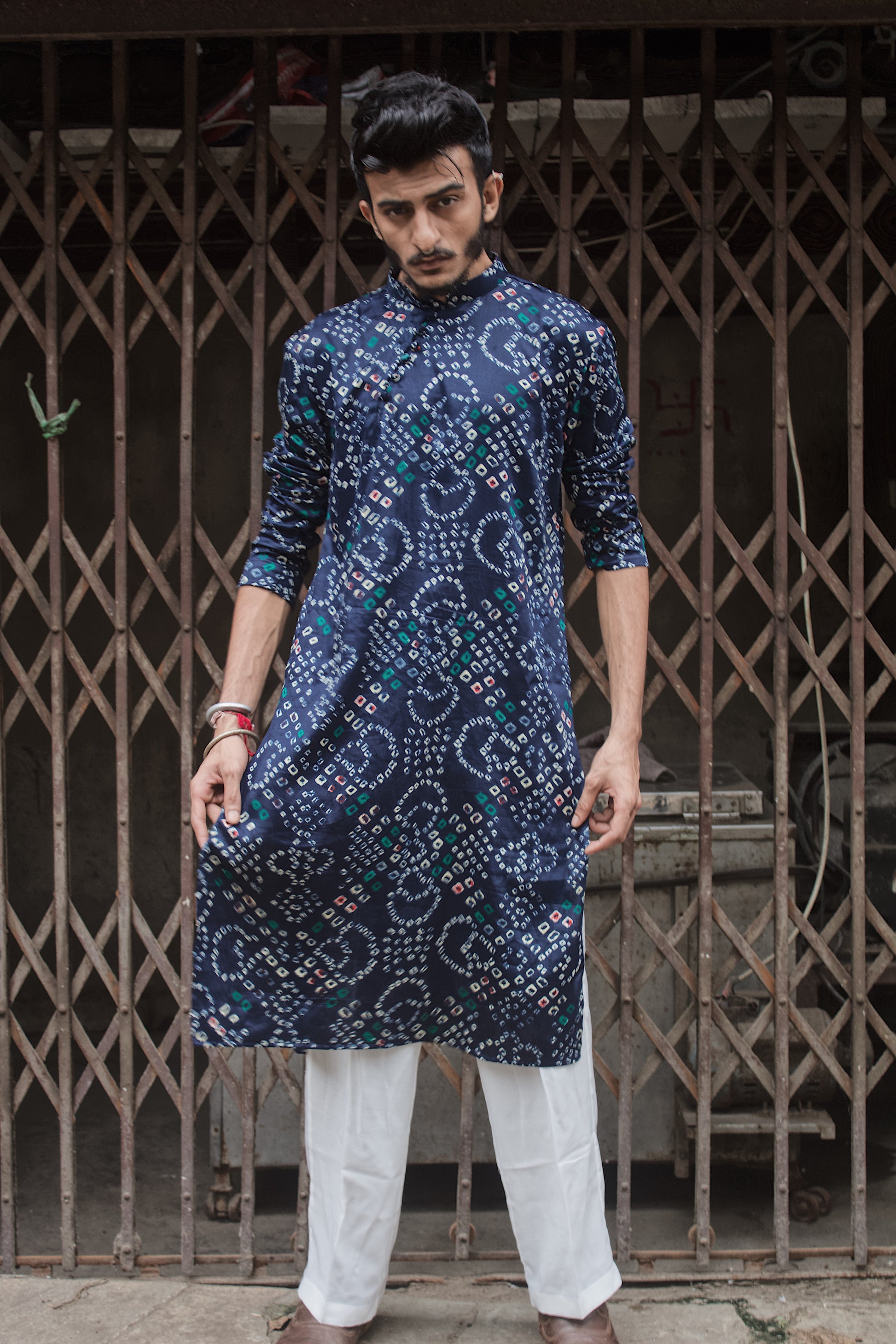 This blue bandhani kurta is made from a blend of cotton for a comfortable and airy fit. With side shoulder button details and a mandarin collar, it offers a touch of unique style. Perfect for any occasion, this kurta will keep you feeling both stylish and comfortable.