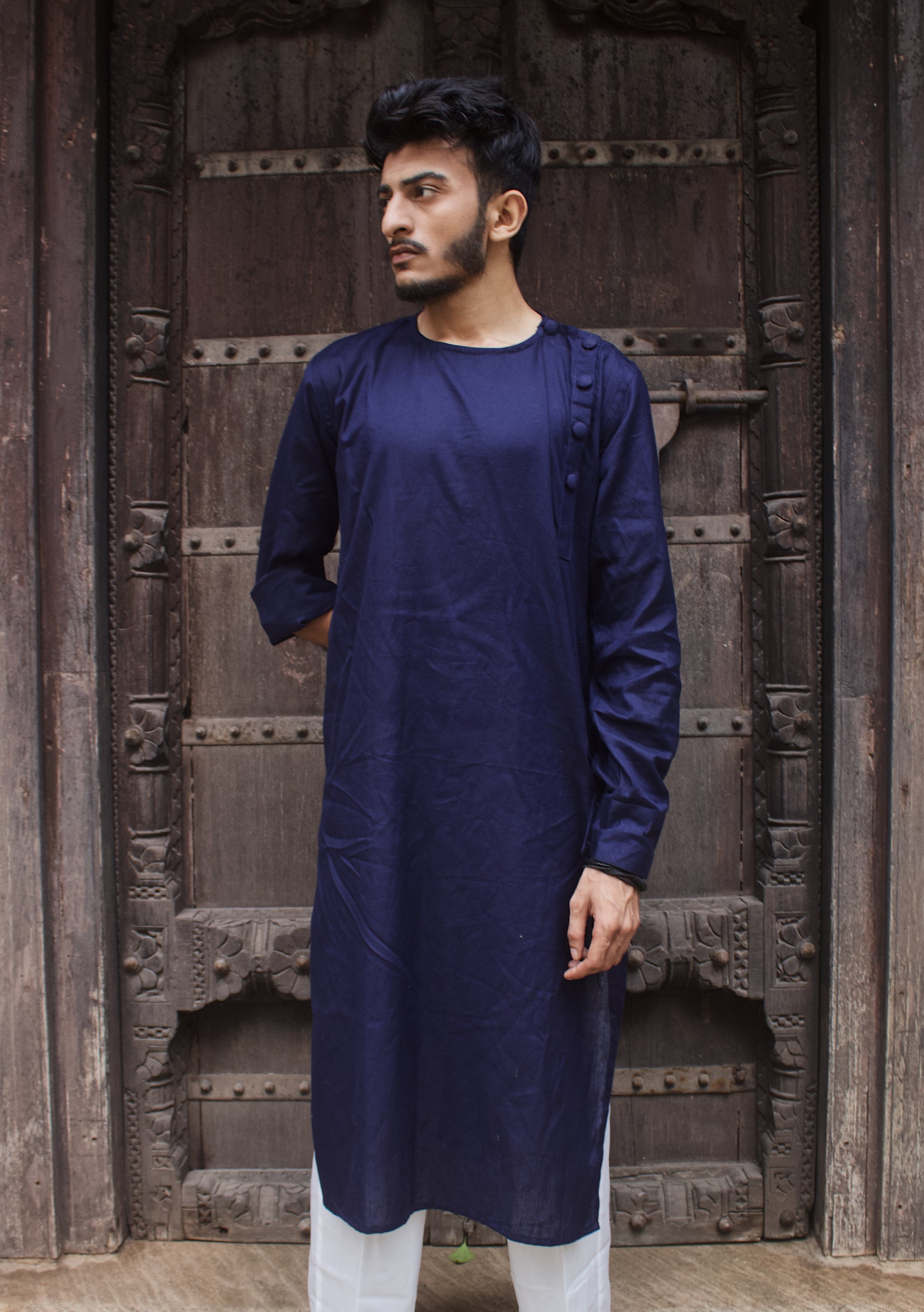 Experience luxury and elegance with our dark blue kurta. Made from a soft blend of silk, it features a unique side button detail on the shoulder. Indulge in the rich fabric and stylish design of this kurta. Perfect for any occasion, elevate your wardrobe with this timeless piece.