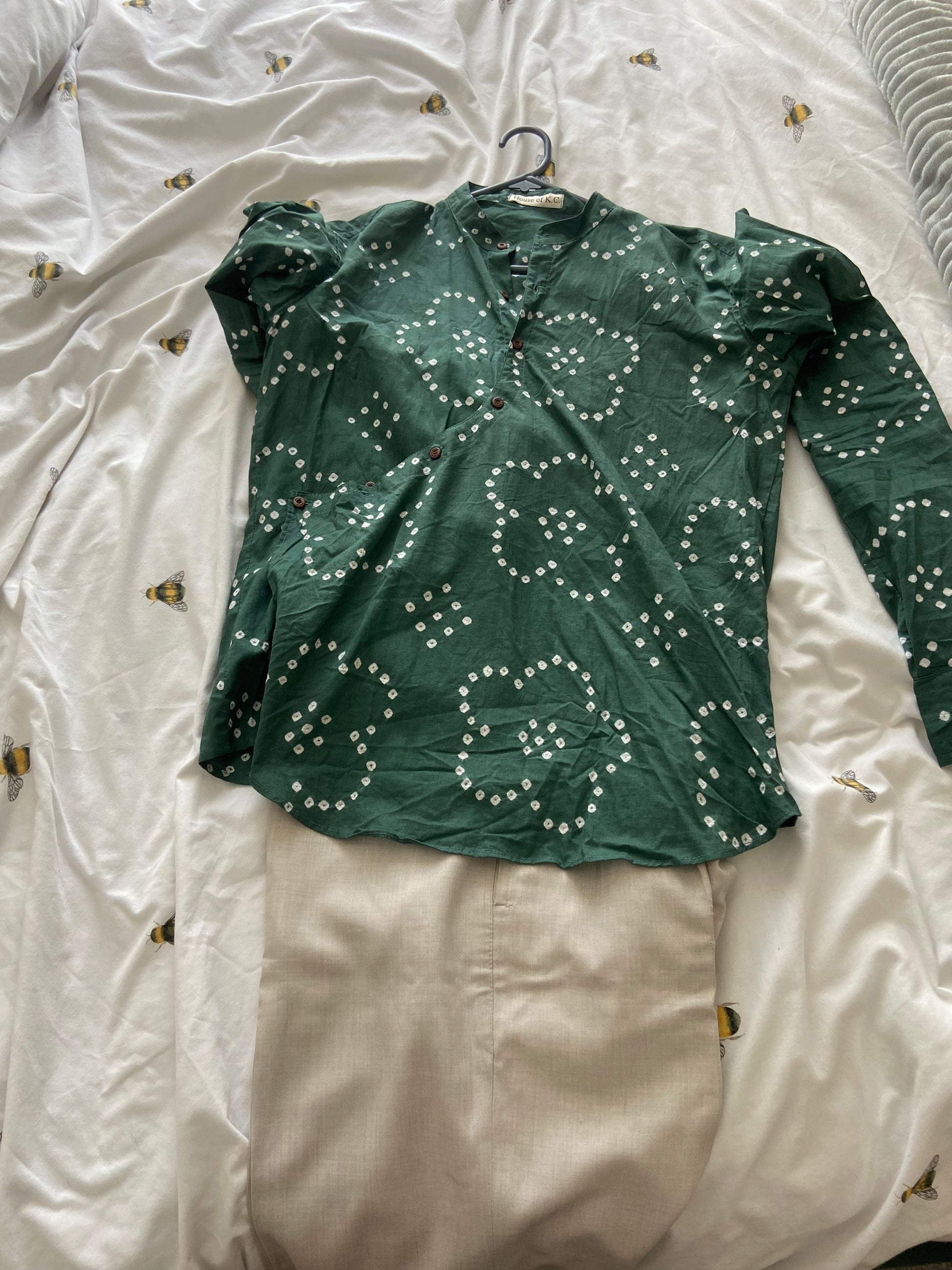 Expertly crafted with handmade bandhani cotton, this green shirt features a unique arch pattern in the front and a sophisticated mandarin collar. Made with precision and attention to detail, this shirt is a must-have for any fashion-forward individual looking for a stylish and comfortable addition to their wardrobe. Elevate your style with this exquisite green bandhani shirt.