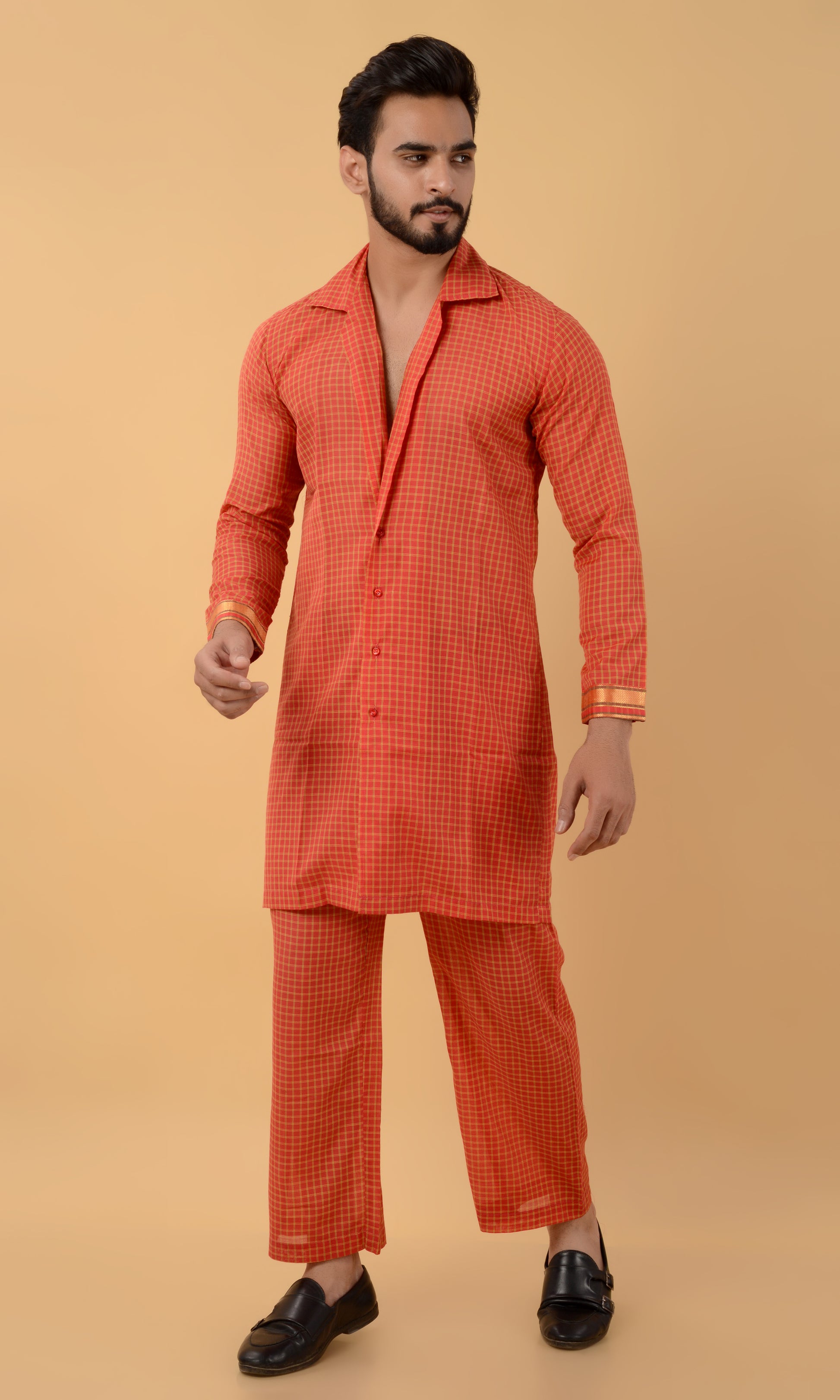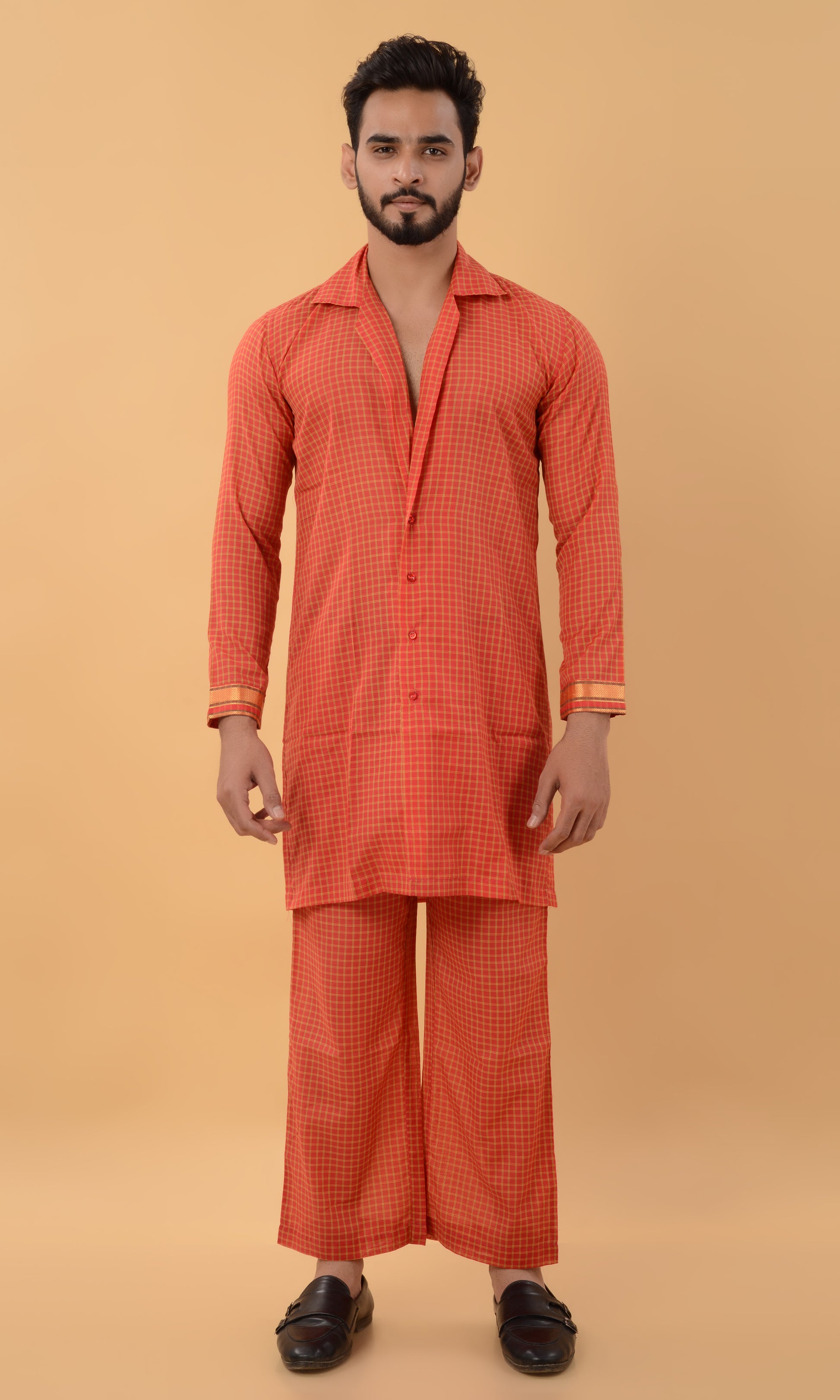 Expertly crafted for a modern look, our Kunbi checks red kurta shirt features a deep v neck collar that adds a touch of sophistication. Made with high-quality materials, this shirt is versatile enough to be dressed up or down, perfect for any occasion. Elevate your wardrobe with this stylish and timeless piece.