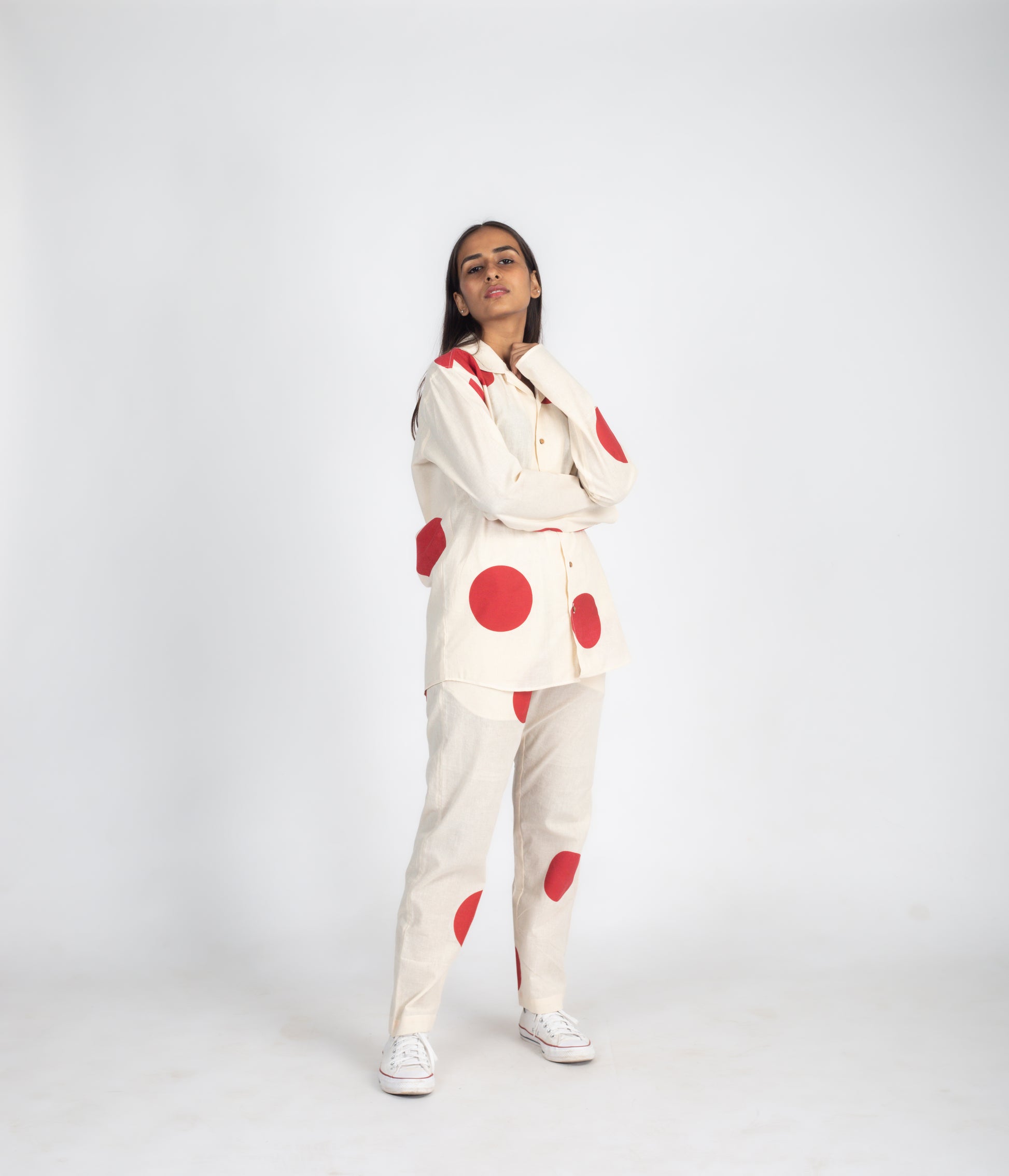 Elevate your style with our Rising Sun Coord set. Made from off white cotton, the full sleeve shirt features a bold red screen printed dot for a touch of unique flair. Complete the look with the matching pants. Elevate your wardrobe with this stylish and comfortable set.
