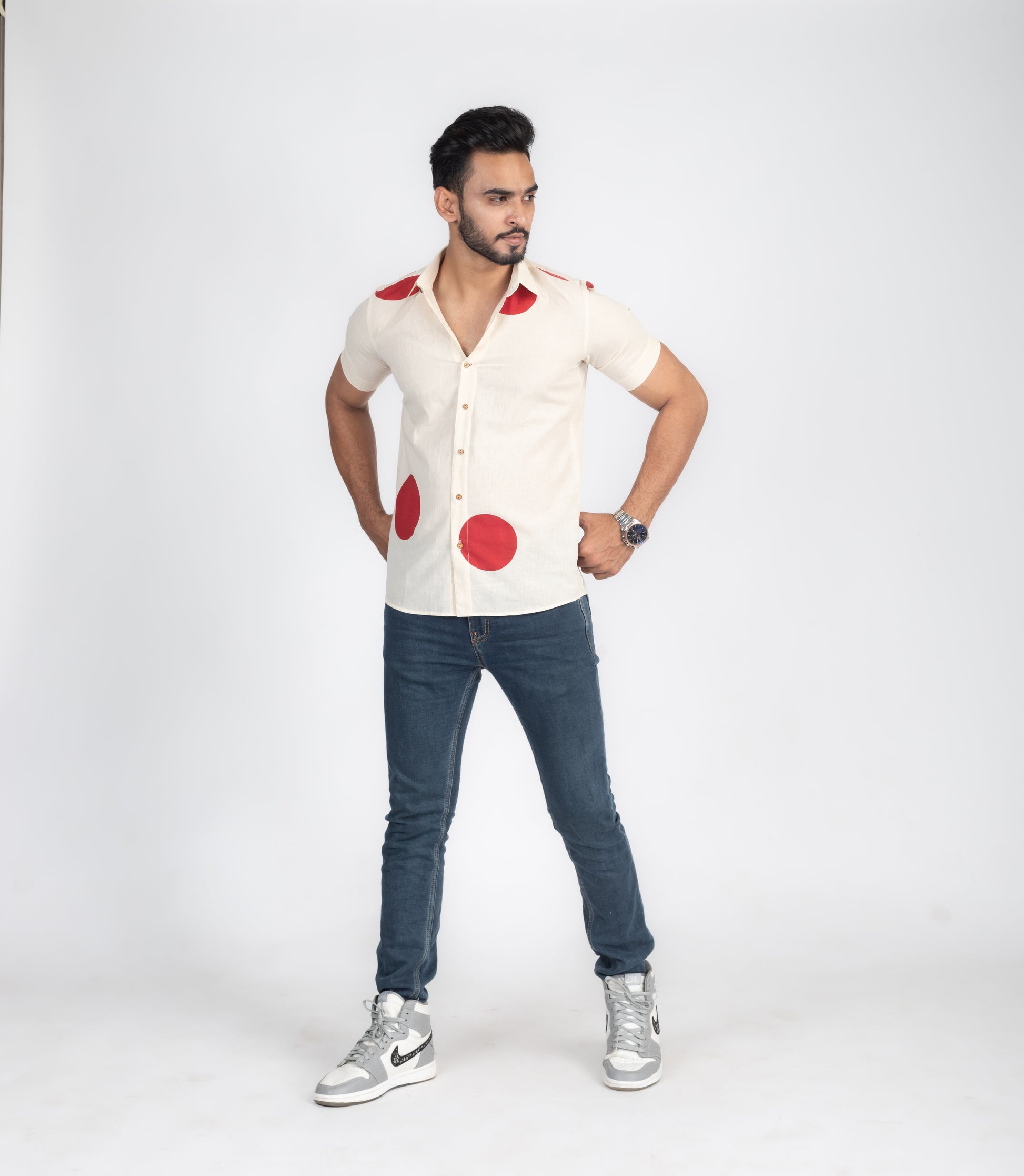 This Rising Sun half sleeves shirt features red screen printed dots on an off-white handwoven cotton shirt. With a classic collar, this shirt offers a professional and stylish look. Made from high-quality materials, this shirt is perfect for any occasion and is sure to impress.