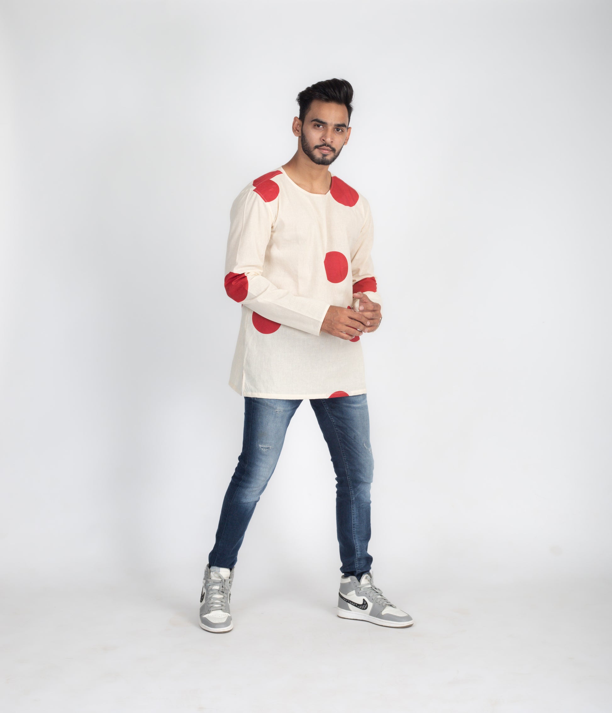 Elevate your style with our Rising Sun Short Kurta Style Shirt. Made with handwoven cotton, this off-white shirt features red dot screen printing, a round neckline, and full sleeves. Enjoy the perfect blend of comfort and sophistication.