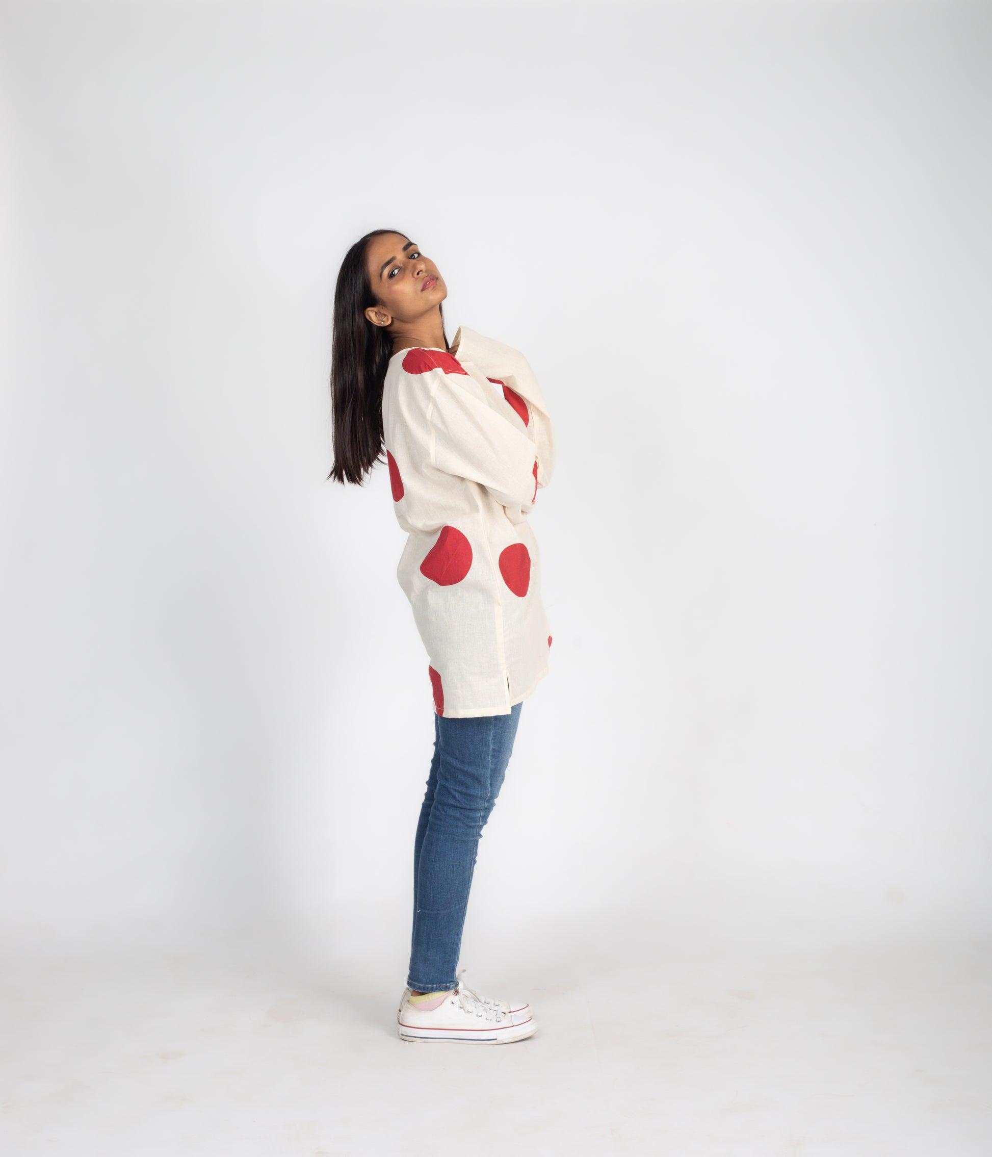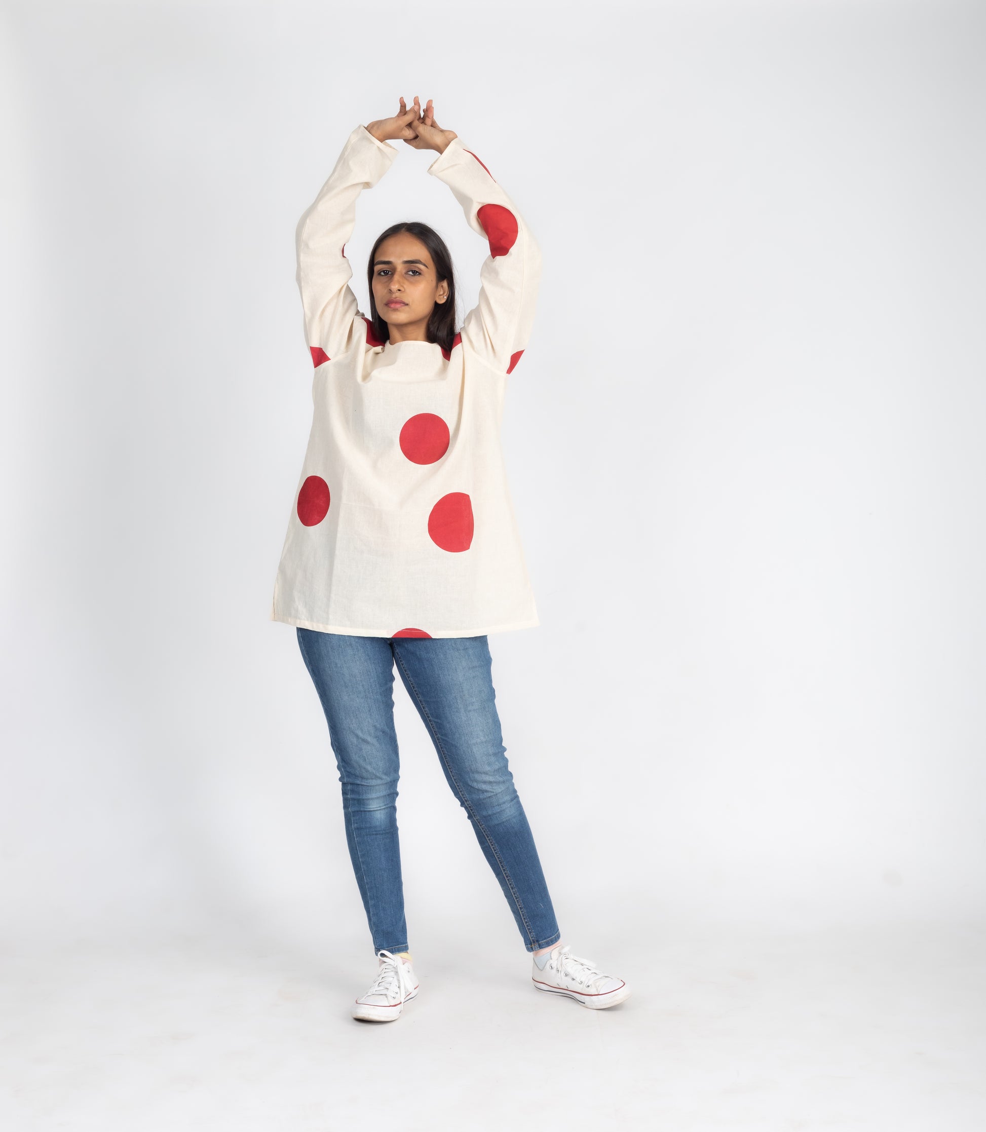 Elevate your style with our Rising Sun Short Kurta Style Shirt. Made with handwoven cotton, this off-white shirt features red dot screen printing, a round neckline, and full sleeves. Enjoy the perfect blend of comfort and sophistication.