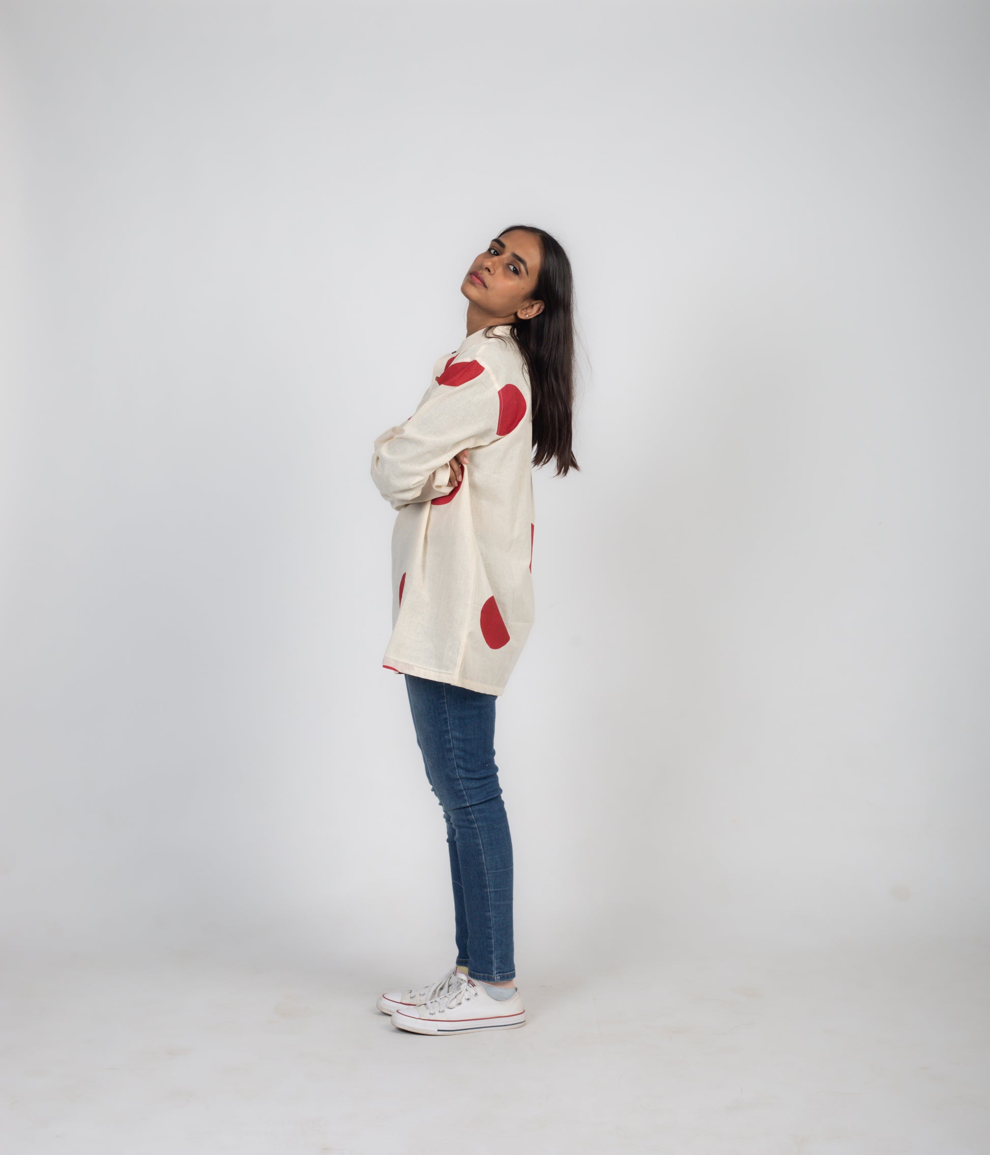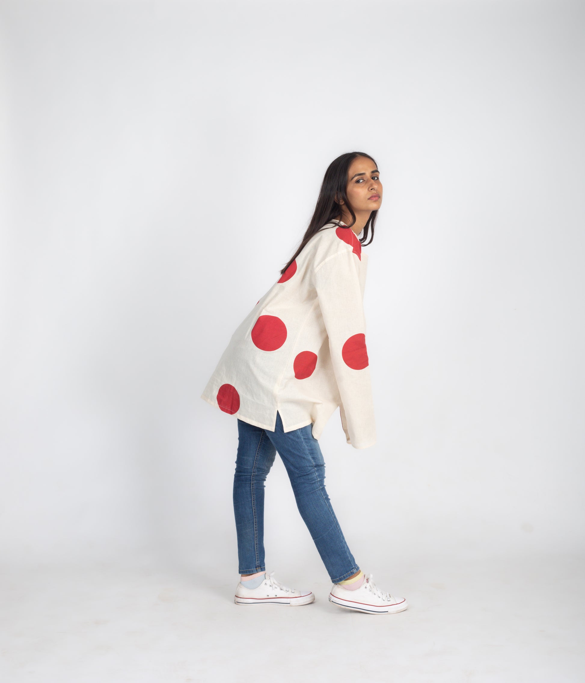 Elevate your style with our Rising Sun Short Kurta Style Shirt. Made with handwoven cotton, this off-white shirt features red dot screen printing, a mandarin collar, and full sleeves. Enjoy the perfect blend of comfort and sophistication.